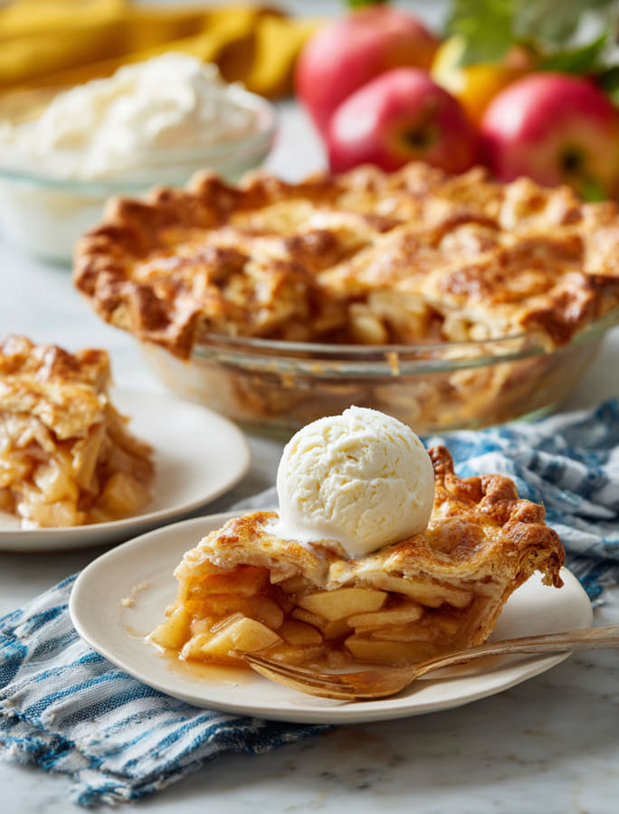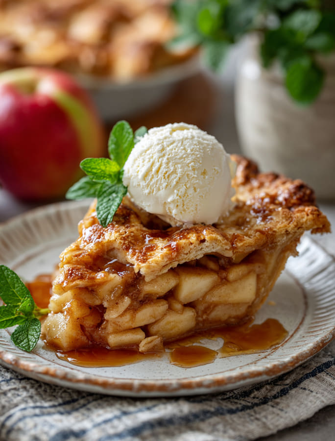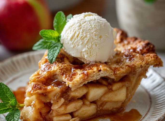 Goldbrauner Pie mit Zimtaroma und einer Kugel Vanilleeis. Perfekt für kuschelige Herbsttage und süße Genussmomente!